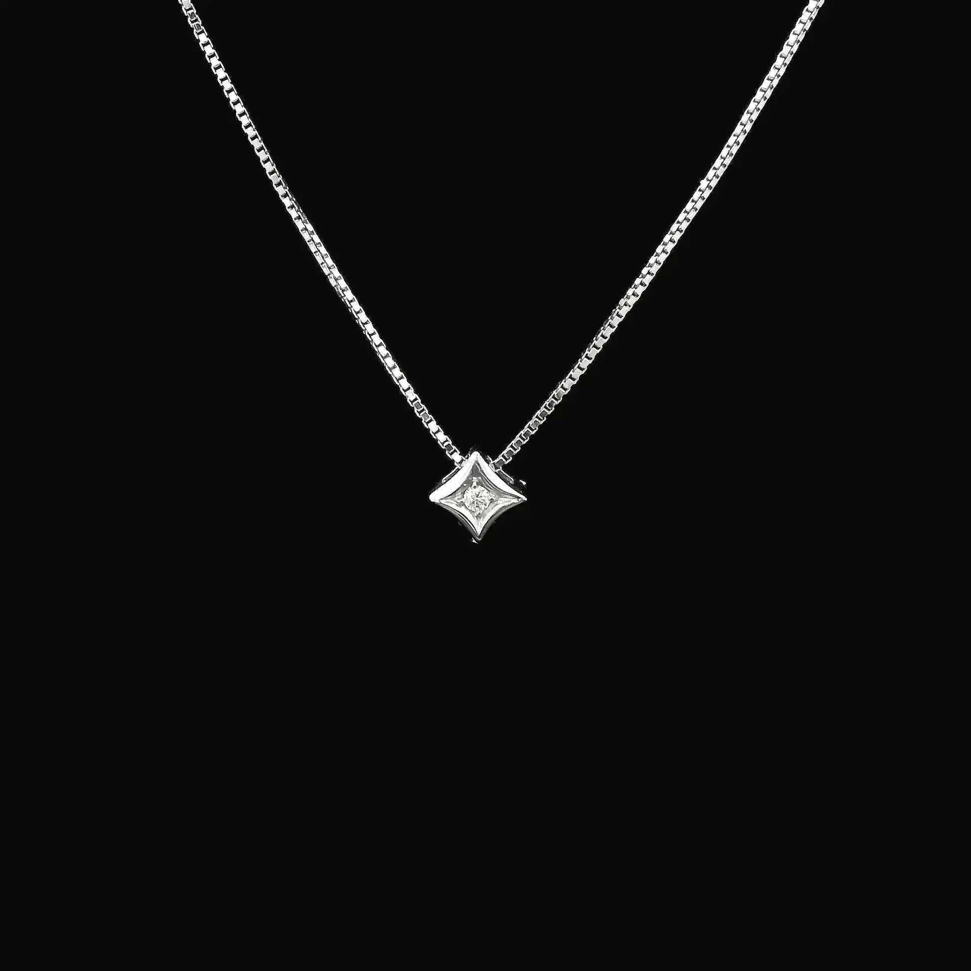 Elegantna verižica iz belega zlata z obeskom, ki ima vkovan diamant je popolna izbira za vse, ki cenijo nežnost, simboliko in brezčasen sijaj. Obesek krasi briljantno brušen diamant, ki ob vsakem gibu čudovito ujame svetlobo in ustvarjajo prefinjen lesk.