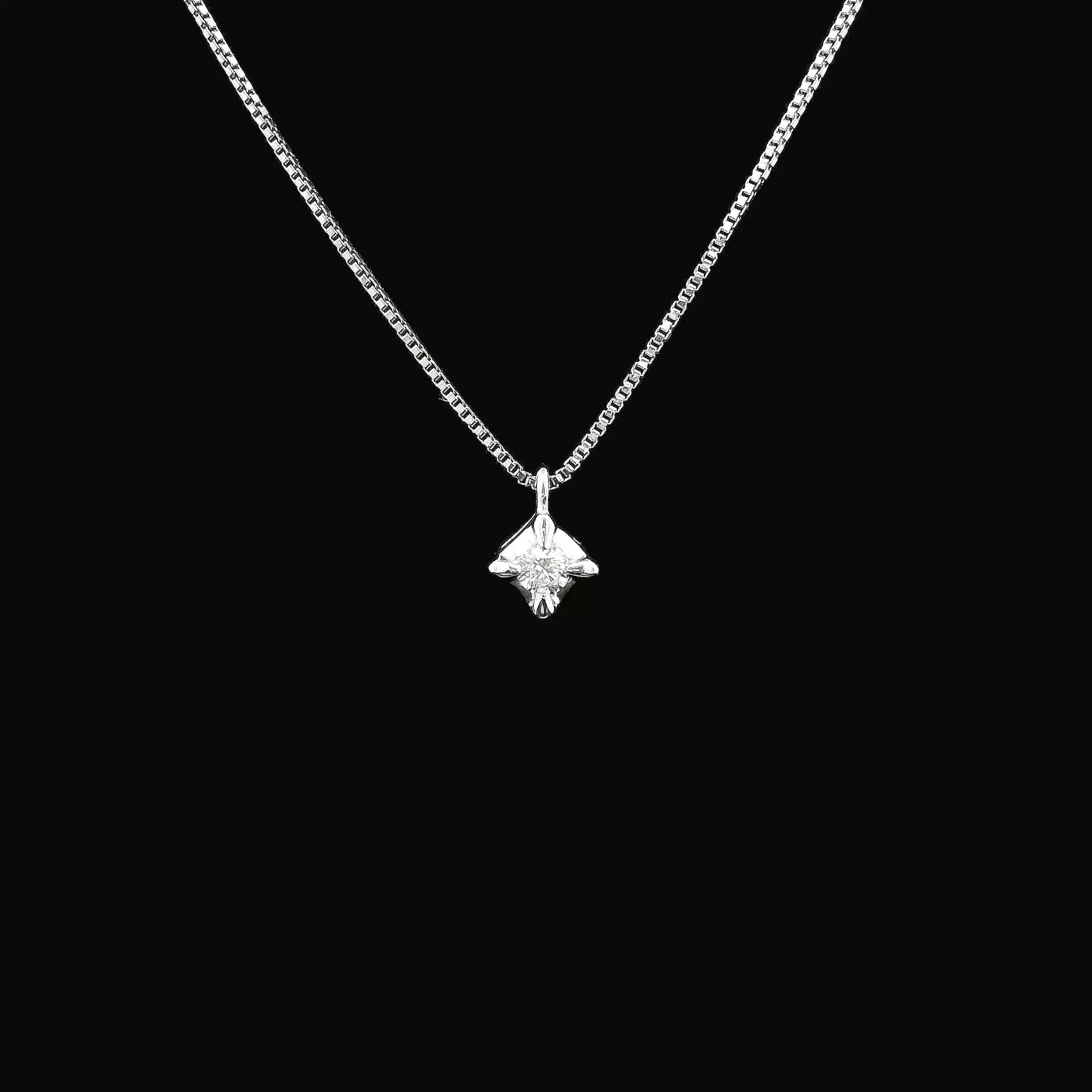 Elegantna verižica iz belega zlata z obeskom, ki ima vkovan diamant je popolna izbira za vse, ki cenijo nežnost, simboliko in brezčasen sijaj. Obesek krasi briljantno brušen diamant, ki ob vsakem gibu čudovito ujame svetlobo in ustvarjajo prefinjen lesk.