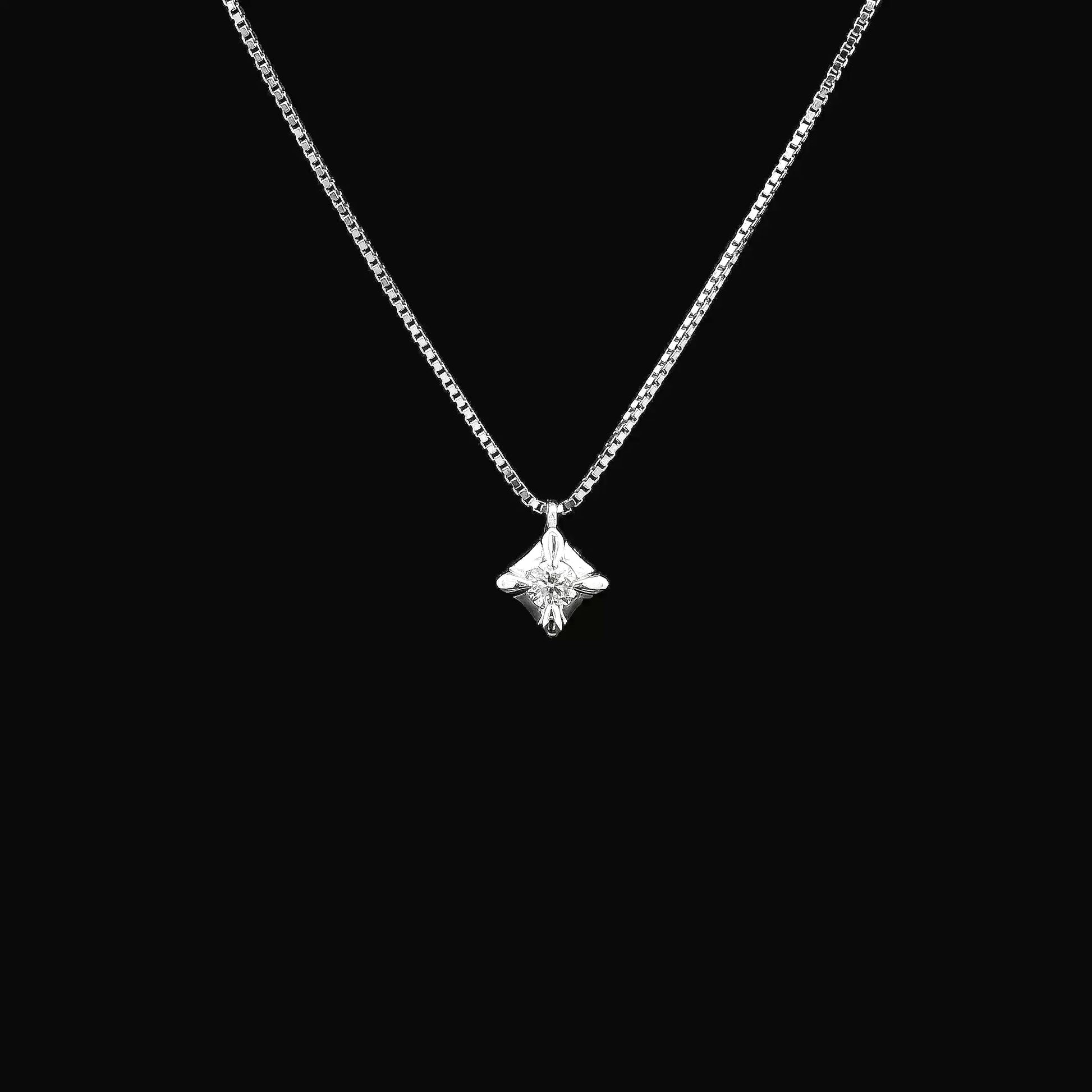 Elegantna verižica iz belega zlata z obeskom, ki ima vkovan diamant je popolna izbira za vse, ki cenijo nežnost, simboliko in brezčasen sijaj. Obesek krasi briljantno brušen diamant, ki ob vsakem gibu čudovito ujame svetlobo in ustvarjajo prefinjen lesk.
