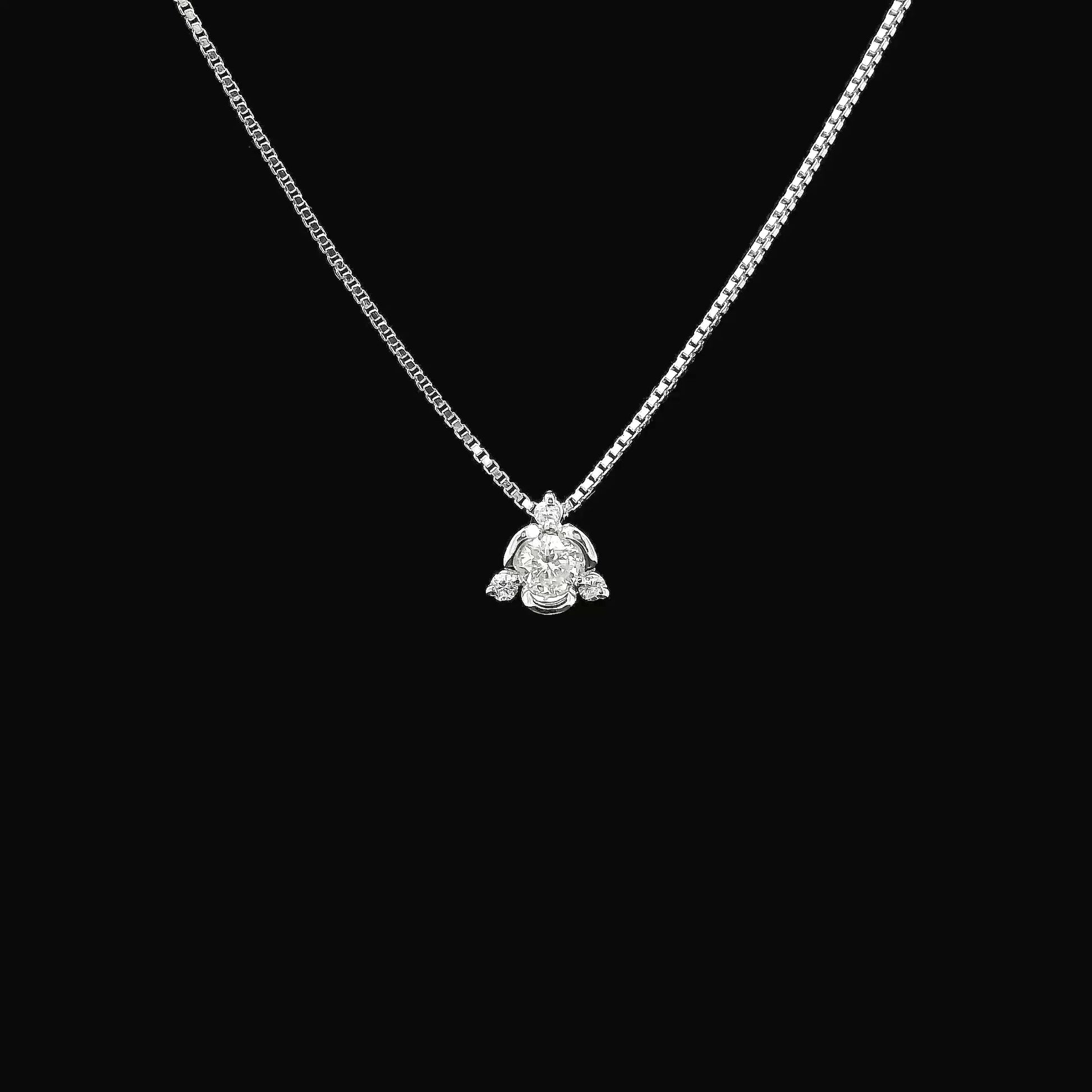 Elegantna verižica iz belega zlata z obeskom, ki ima vkovan diamant je popolna izbira za vse, ki cenijo nežnost, simboliko in brezčasen sijaj. Obesek krasi briljantno brušen diamant, ki ob vsakem gibu čudovito ujame svetlobo in ustvarjajo prefinjen lesk.