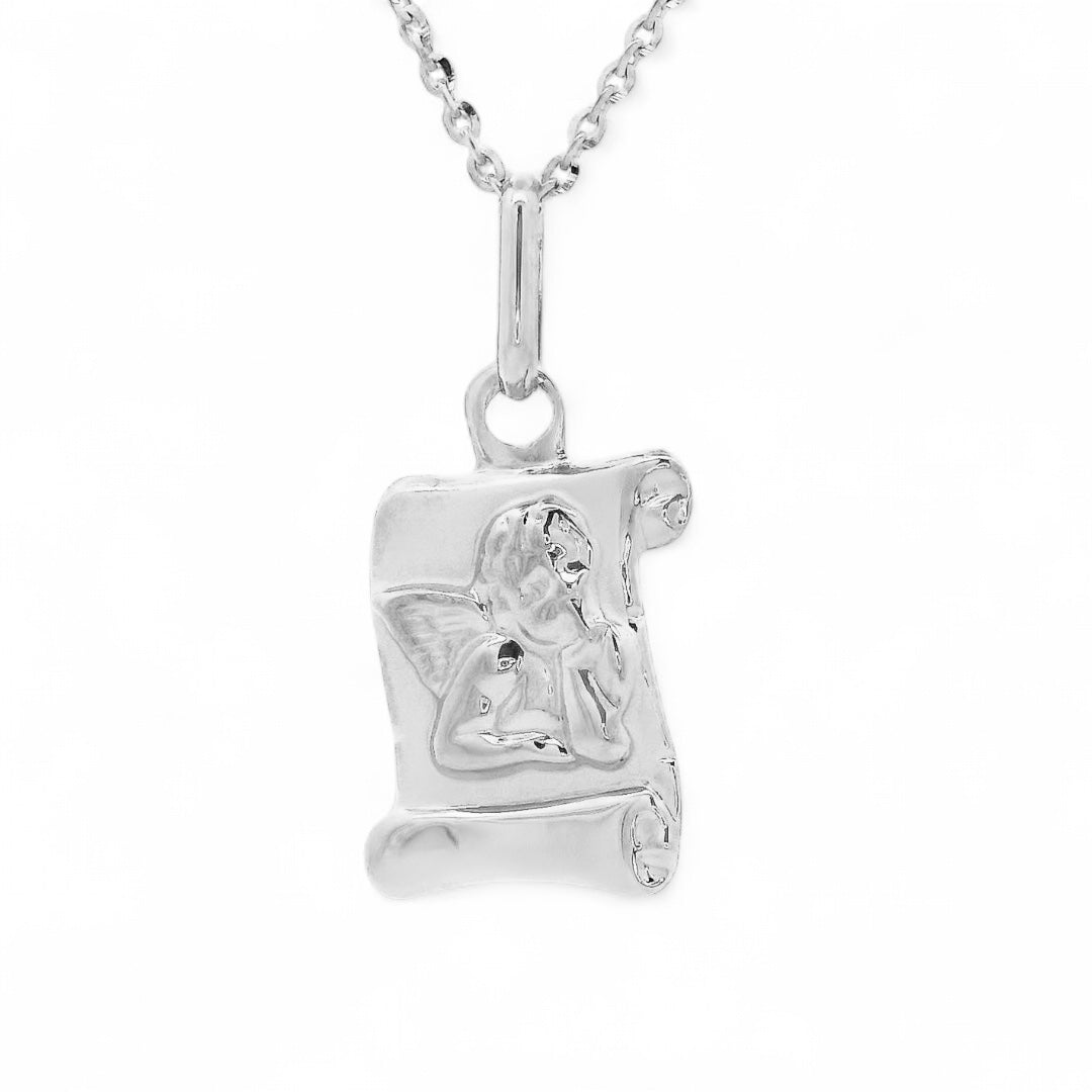 Dodajte svoji verižici pridih glamurja s čudovitim obeskom iz belega zlata, okrašenim z izbočenim angelčkom.