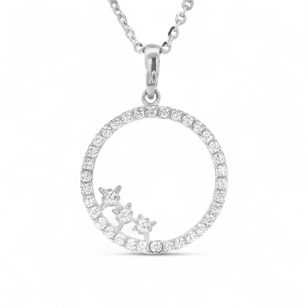 Dodajte svoji verižici pridih glamurja s čudovitim obeskom iz belega zlata, okrašenim z natančno brušenimi cirkoni. Ta brezčasni kos nakita združuje toplino 14-karatnega zlata in svetlikajoč se sijaj cirkonov, ki ujamejo svetlobo ob vsakem gibu.