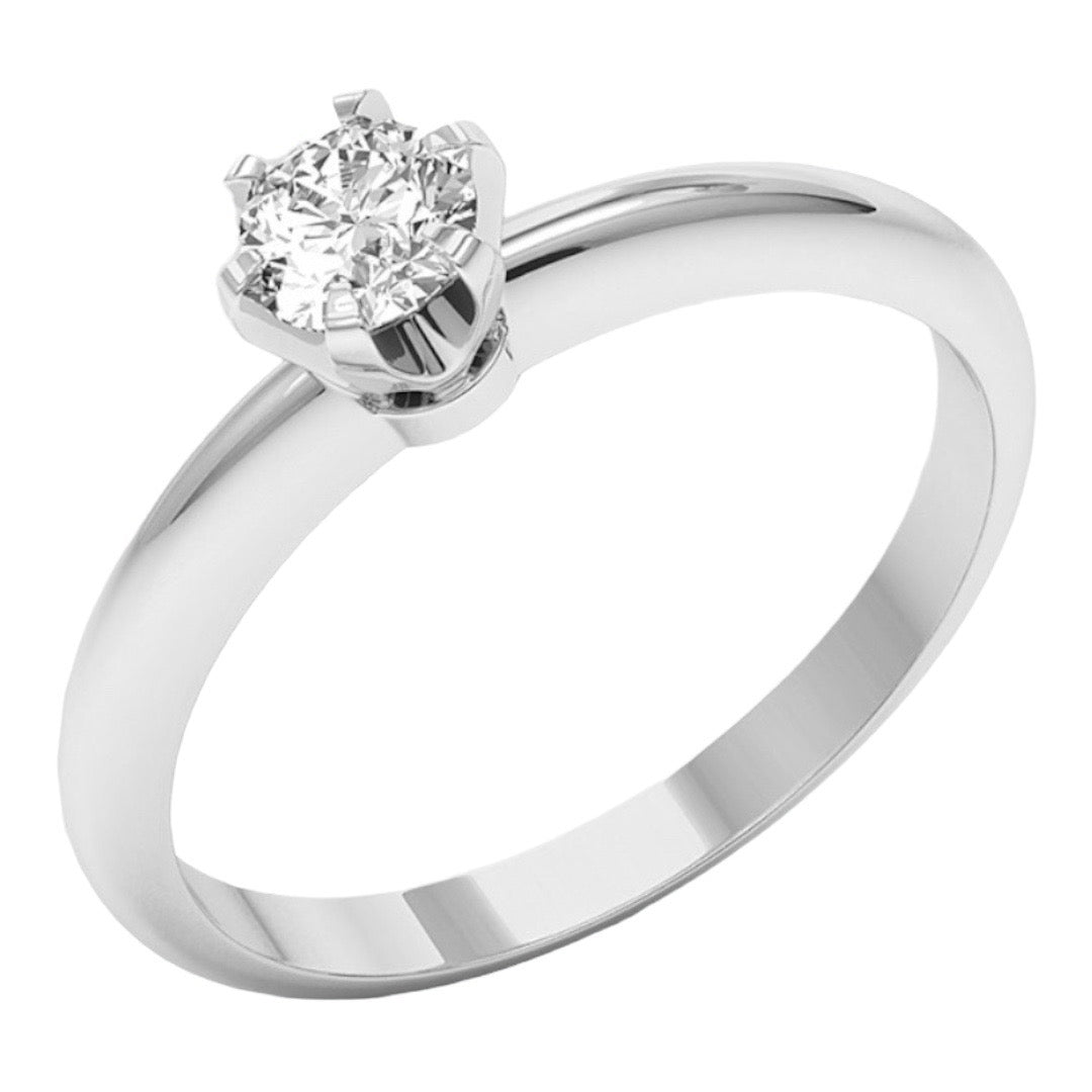 Zaročni prstan iz belega zlata je izjemno čudovit in simboličen kos nakita, ki izraža ljubezen, predanost in trajnost med zaljubljencema. Izdelan iz visokokakovostnega belega zlata, ki mu daje čudovit sijaj in eleganco, prstan ponosno nosi simboliko zavezanosti, ki jo par izraža ob obljubi večne ljubezni in partnerstva.