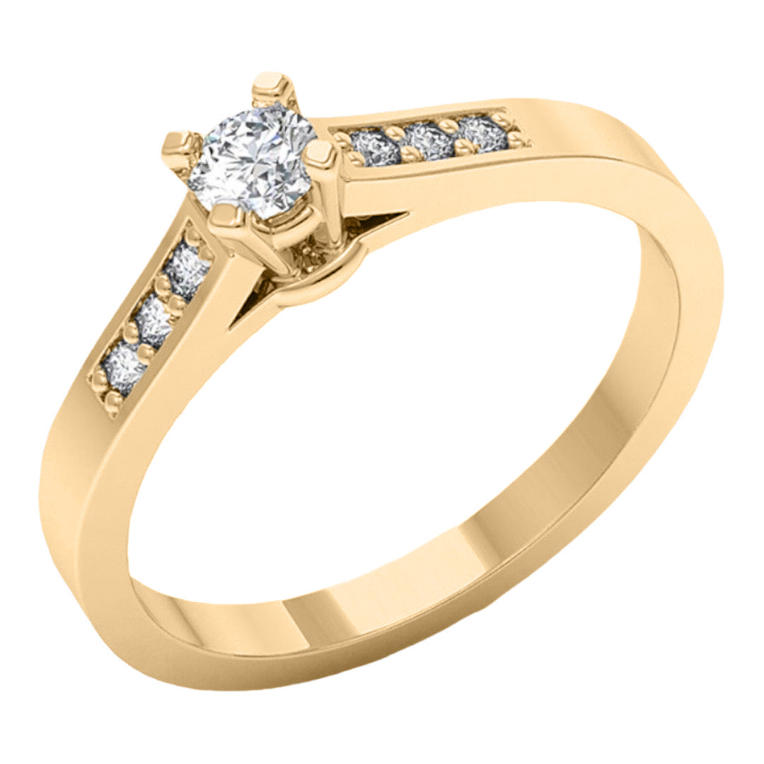 Vsak prstan v tej zbirki je ročno oblikovan z izjemno natančnostjo, ki poudarja vsak detajl in ustvarja harmonično ravnovesje med klasično eleganco in sodobnim dizajnom. Diamanti, ki krasijo te prstane, so izbrani z največjo skrbnostjo, njihov bleščeč sijaj pa je neprekosljiv. Vsi naši zaročni prstani v rumenem zlatu so oblikovani tako, da so popoln izraz vaše ljubezni in predstavljajo simbol večne zaveze.